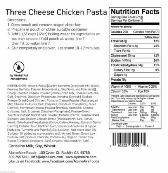 AlpineAire Three Cheese Chicken Pasta Freeze Dried Camping Food Pouch 60441.