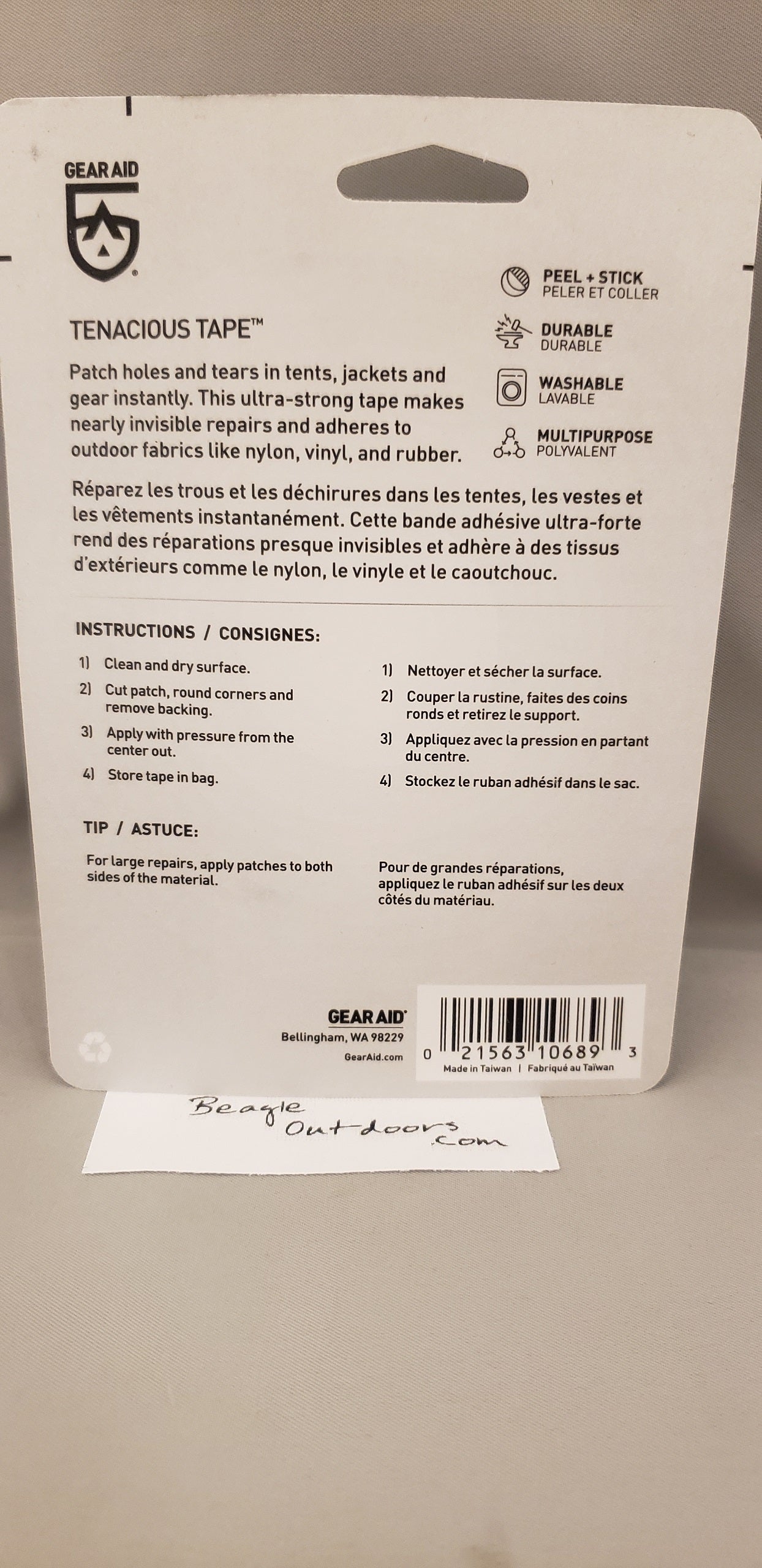 - Washable – Fabric tape is sealed with a waterproof coating and won’t peel off during a wash or a storm