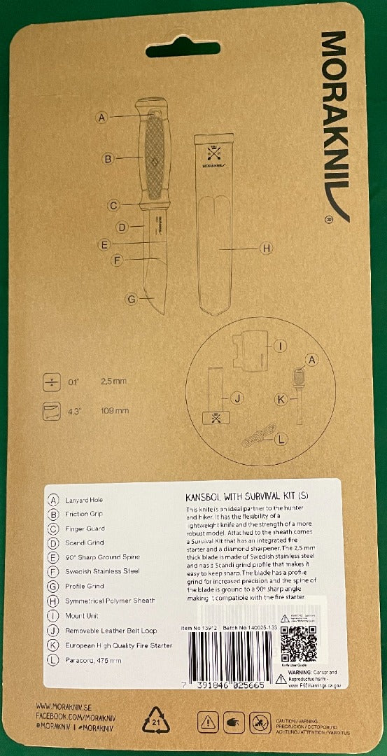 The Kansbol (S) has the flexibility of a lightweight knife and the strength of a more robust model. Attached to the sheath comes a Survival Kit that has an integrated fire starter and a diamond sharpener. The 2.5 mm thick blade is made of Swedish stainless steel and has a Scandi grind edge profile that makes it easy to keep sharp. The blade has a profile grind for increased precision and the spine of the blade is ground to a 90 sharp angle making it compatible with the fire starter.