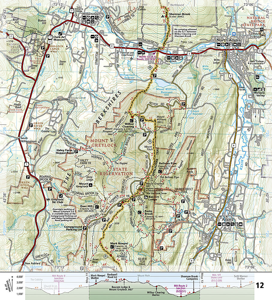 Other features found on this map include: Bear Mtn, Beartown State Forest, Brassie Brook Shelter, Cheshire, Clarksburg State Forest, Cornwall Bridge, Dalton, East Mtn State Forest, Falls Village, Glen Brook Shelter, Great Barrington, Housatonic State Forest, Kay Wood Shelter, Kent, Lee, Limestone Spring Seth Warner Shelter, Mark Noepel Shelter, Mount Algo Shelter, Mount Greylock State Reservation, Mt Everett, Mt Greylock, Mt Wilcox North Shelter, Mt Wilcox South Shelter, North Adams, October Mountain State Forest, October Mtn Shelter, Pine Swamp Brook Shelter, Pittsfield, Rands View, Riga Shelter, Stewart Hollow Brook Shelter, Ten Mile River Shelter, The Hemlocks Shelter, Tom Leonard Shelter, Tyringham, Wilbur Clearing Shelter, Wiley Shelter.