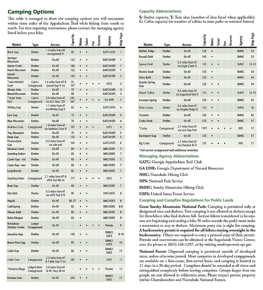 Other features found on this map include: A. Rufus Morgan Shelter, Blood Mountain, Blood Mountain Shelter, Blue Mountain Shelter, Bly Gap, Brown Fork Gap Shelter, Cable Gap Shelter, Carter Gap Shelter, Chattahoochee National Forest, Clayton, Clingmans Dome, Cold Spring Shelter, Cosby Knob Shelter, Davenport Gap Shelter, Deep Gap Shelter, Derrick Knob Shelter, Dicks Creek Gap, Double Spring Gap Shelter, Fontana Dam Shelter, Fontana Lake, Franklin, Gooch Mountain Shelter, Great Smoky Mountains National Park, Hawk Mountain Shelter, Helen, Icewater Spring Shelter, Long Branch Shelter, Low Gap Shelter, Mollies Ridge Shelter, Mount Collins Shelter, Mount Guyot, Muskrat Creek Shelter, Nantahala National Forest, Newfound Gap, Pecks Corner Shelter, Plumorchard Gap Shelter, Rock Gap Shelter, Russell Field Shelter, Sassafras Gap Shelter, Siler Bald Shelter, Silers Bald Shelter, Spence Field Shelter, Springer Mountain, Springer Mountain Shelter, Standing Indian Shelter, Stover Creek Shelter, Suches, Tray Mountain Shelter, Tri-Corner Knob Shelter, Wayah Bald, Wayah Shelter, Wesser Bald Shelter, Whitley Gap Shelter, Woods Hole Shelter.