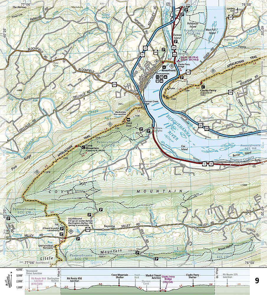 Other features found on this map include: Alec Kennedy Shelter, Anna Michener Shelter, Antietam Shelter, ATC Mid-Atlantic Regional Office, Birch Run Shelter, Boiling Springs, Caledonia State Park, Clarks Ferry Shelter, Cove Mountain Shelter, Cowall Shelter, Darlington Shelter, Deer Lick Shelter, Duncannon, Ironmasters Mansion Shelter, James Fry (Tagg Run) Shelter, Lebanon, Michaux State Forest, Milesburn Shelter, Peters Mountain Shelter, Pine Grove Furnace State Park, Quarry Gap Shelter, Rausch Gap Shelter, Raven Rock, Rocky Mountain Shelter, South Mtn State Park, Susquehanna River, Swatara Gap, Swatara State Park, Toms Run Shelter, Tumbling Run Shelter.