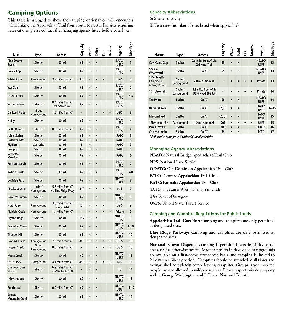 Other features found on this map include: Afee Knob, Apple Orchard Mountain, Appomattox, Bailey Gap Shelter, Black Horse Gap, Bobblets Gap Shelter, Brown Mtn Creek Shelter, Bryant Ridge Shelter, Calf Mountain, Calf Mtn Shelter, Campbell Shelter, Catawba Mtn Shelter, Cornelius Creek Shelter, Cove Mountain Shelter, Cow Camp Gap Shelter, Fullhardt Knob Shelter, George Washington National Forest, Harpers Creek Shelter, Humpback Mountain, Jefferson National Forest, Johns Hollow Shelter, Johns Spring Shelter, Lamberts Meadow Shelter, Laurel Creek Shelter, Lynchburg, Matts Creek Shelter, Maupin Field Shelter, Niday Shelter, Paul C. Wolfe Shelter, Pickle Branch Shelter, Pine Swamp Branch Shelter, Punchbowl Shelter, Reeds Gap, Rockfish Gap, Sarver Hollow Shelter, Seeley- Woodworth Shelter, The Priest, The Priest Shelter, Thunder Hill Shelter, Troutville, War Spur Shelter, Waynesboro, Wilson Creek Shelter.