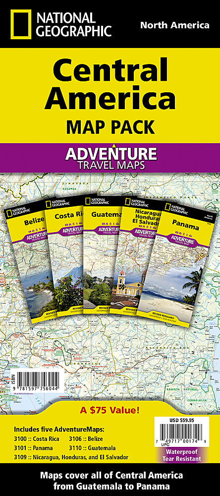 The National Geographic Adventure Central America Map Pack is the perfect companion for anyone who wants to travel in Central America. The Map Pack includes five Adventure maps that cover all of the countries of Central America. Travel from the amazing ruins of Tikal in Guatemala through the volcanic highlands of Nicaragua and the pristine beaches of Costa Rica all the way to the Panama Canal. Each of the five maps cover these areas in detail with points of interest, intricate road networks, and an index of places to help you find even the smallest town.