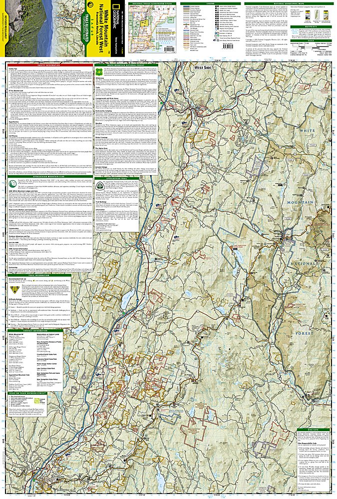 This Trails Illustrated topographic map is the most comprehensive recreational map for the White Mountains (Lincoln, Franconia Notch). Coverage area includes: White Mountain National Forest; Pemigewasset and Sandwich Range wilderness areas; Appalachian National Scenic Trail from Hanover, NH to Crawford Notch State Park; Franconia Notch and Echo Lake state parks; Kancamagus Highway, Tripoli Road, and Bear Notch Road. Also includes Plymouth, Rumney, Lincoln, Twin Mountain, North Conway and Wonalancet.
