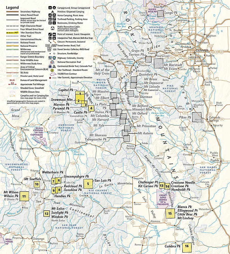 San Juan Range: El Diente Peak* , Mount Eolus, North Eolus*, Handies Peak, Redcloud Peak, San Luis Peak, Mount Sneffels, Sunlight Peak, Sunshine Peak, Uncompahgre Peak, Wetterhorn Peak, Mount Wilson, Wilson Peak, Windom Peak