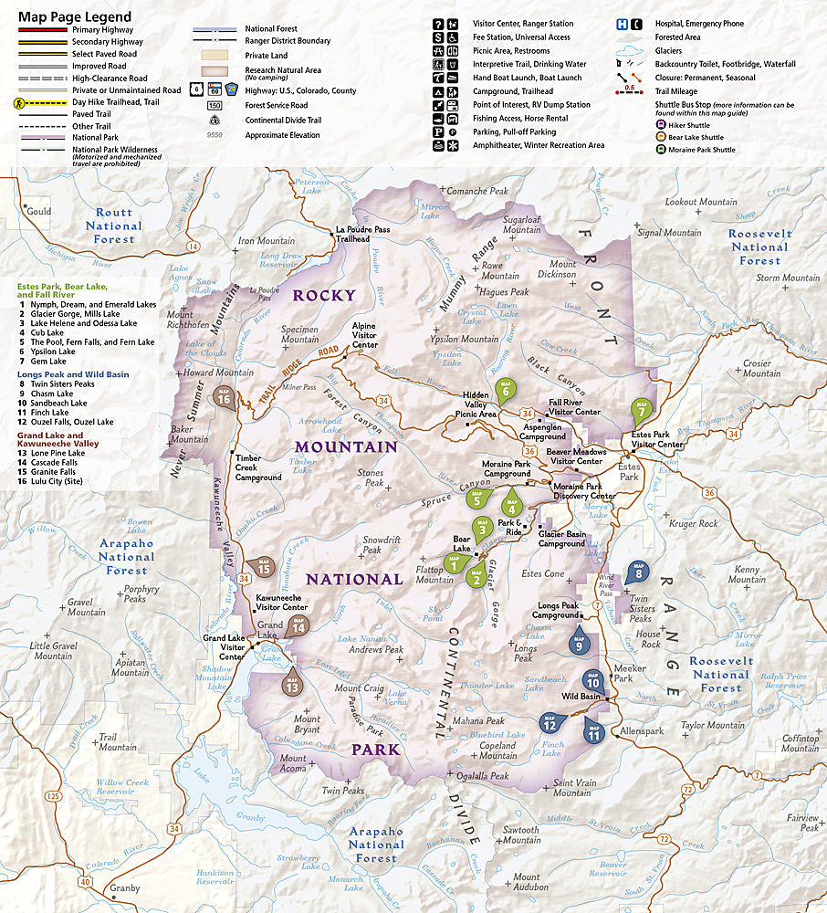 Some of the must-visit sites in this Topographic Map Guide are: Ouzel Falls and Calypso Fallstwo scenic waterfalls in one hike in the Wild Basin; and Lulu Citya historic site within the park where prospectors lived and mined silver and gold during the late 19th Century.