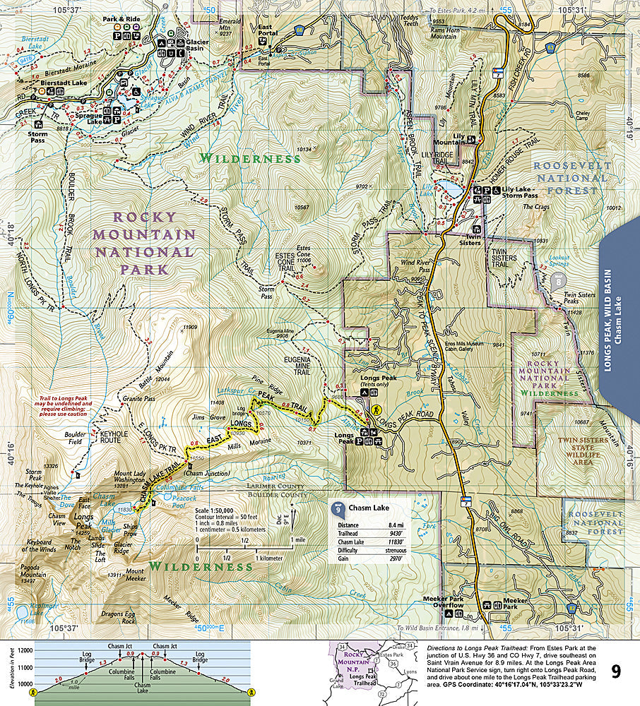 The Rocky Moutain National Park Day Hikes Topographic Map Guide includes sixteen diverse hikes for all hiking enthusiasts, from the easy, 4.7 mile long Cub Lake Trail to the strenuous, 8.4 mile long Chasm Lake Trail that brings hikers to base of the 14,259 foot Longs Peak. Each hike has a detailed map, a trail profile visualizing the changes in elevation, and a short summary of the interesting features encountered along the trip.
