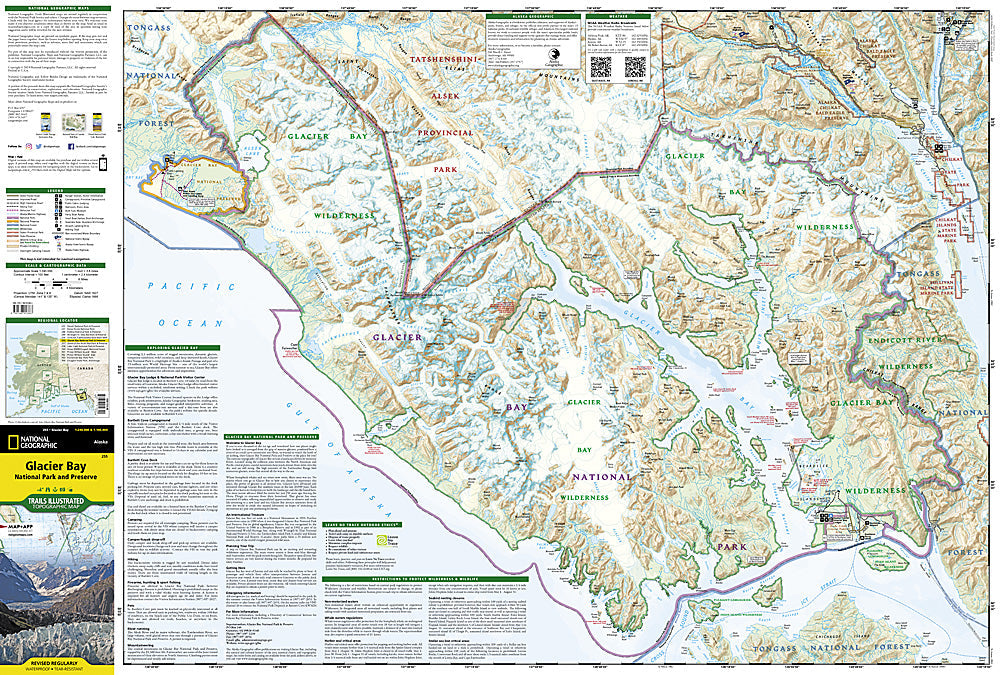 This Trails Illustrated map for Glacier Bay National Park, Glacier Bay National Preserve, and surrounding area and surrounding area in Alaska's panhandle is perfect for hiking, camping, boating, paddling, and wildlife viewing in this scenic, rugged frontier. This two-sided map includes Glacier Bay National Park, Glacier Bay National Preserve, Glacier Bay Wilderness, portions of Tongass National Forest, Chicagof Island, Endicott River Wilderness, Haines State Forest and Resource Management Area, Chilkat State Park, Chilkat Islands, Sullivan Island State Marine Park, Pleasant Island, Lemesurier Island, Inian Islands, and Tatshenshini Alsek Park. Waterways include the Gulf of Alaska, Glacier Bay, Cross Sound, Icy Strait, Lynn Canal, Geikie Inlet, Muir Inlet, Tarr Inlet, Jophns Hopkins Inlet, Tituya Bay, Taylor Bay, North Passage, Berners Bay, Chilkoot Inlet, Chilkat Inlet, Wachusett Inlet, Queen Inlet, Rendu Inlet, Tidal Bay, Scidmore Bay, and more. Water depths for Glacier Bay and its inlets are also shown. The map has detailed insets of Gustavus, Tarr Inlet and Johns Hopkins Inlet, and Lamplugh Glacier. Natural features include the Fairweather Range, Brady Glacier, St. Elias Mountains, Takhins Mountains, Chilkat Range, Carroll Glacier, Riggs Glacioer, McBride Glacier, and more. Includes UTM tick marks for use with your GPS unit.