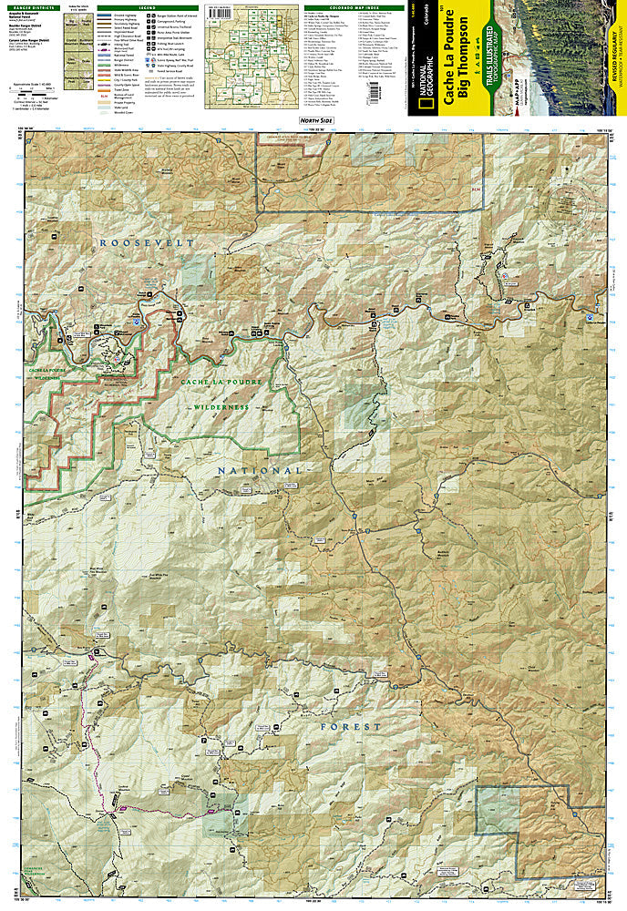 TheCache La Poudre / Big ThompsonTrails Illustrated map is the most comprehensive recreational map for this beautiful area of Colorado.Coverage includes Arapaho and Roosevelt national forests, Cache La Poudre River and Wilderness, Poudre Park, Pinewood Springs, Midway, Glen Haven and Homestead Meadows, Big Thompson River and Canyon, Pinewood Lake, Lake Estes, Viestenz Smith Mountain Park. Includes UTM grids for use with your GPS unit.