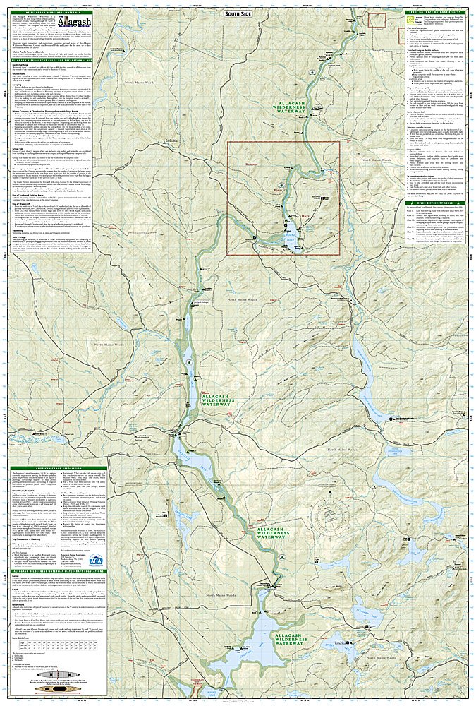 The Allagash Wilderness Waterway North map details the far northern reaches of the waterway on the Canadian border south of Churchill Lake. The front or North side of the map includes the area stretching from Fort Kent State historic site on the Saint John River south to Saint Froid Lake. It also includes the Saint Francis, Fish, and Allagash Rivers and the northern portion of Eagle Lake. The south side of the map shows Long Lake, Umsaskis Lake, the five Musquacook Lake, Spider Lake, and Pleasant Lake.