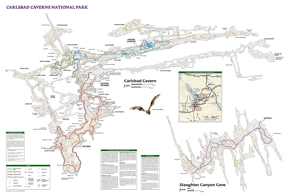 This two-sided map shows two worlds - the beautiful landscape in and around Carlsbad National Park and Wilderness area on one side, and one of the world's most fascinating and accessible underground wonders on the other.