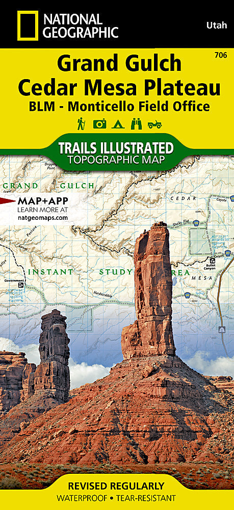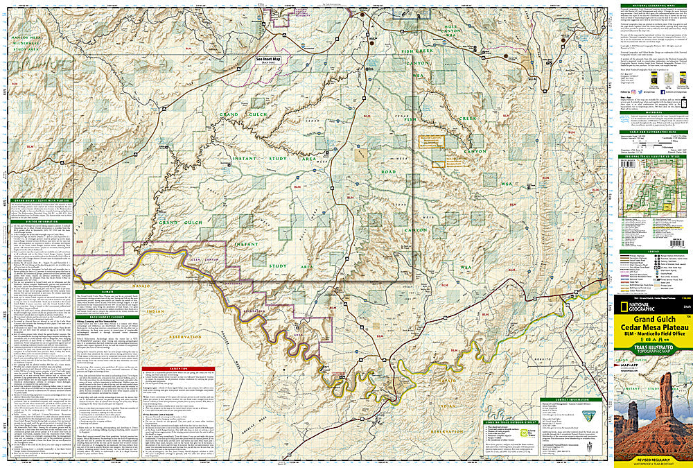 This Trails Illustrated topographic map is the most comprehensive and complete recreational map for Utah's Grand Gulch Plateau area. Coverage includes BLM/San Juan Resource Area; Grand Gulch Primitive Area; Grand Flat, Northern Glen Canyon National Recreation Area, Valley of the Gods, Cedar Mesa, Snow Flat, Grand Flat and Comb Ridge; First, Fish and Owl Creek, Polly Mesa and San Juan River.